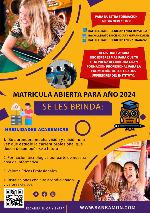 Estudie nuevamente en el Centro de Educación Media No Gubernamental Privado San Ramón, igual que en secundaria. En este etapa educativa, mi conocimiento se eleveo en un nivel más complejo, con mayor desarrollo en cuanto al desempeño de la carrera del Bachillerato Técnico Profesional en Informática. Durante los últimos 3 años en el centro educativo de esta etapa, tuve la experiencia y el conocimiento necesario a la habilidad de crear programas web junto con el conocimiento de lenguajes de programación, reparar computadoras, optimizarla y bridar mantenimiento a áreas de conexión al acceso a internet.